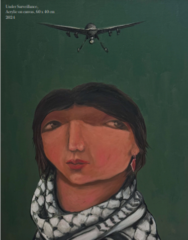 Technologie duikt vaak op in zijn schilderijen. Camera’s, drones, gsm’s. Ze controleren en domineren de mens. In het dagelijks leven, maar zeker in een oorlogssituatie, zeker in Gaza waar huizen, huishoudens, zelfs emoties geregistreerd en gecontroleerd worden. Artificiële intelligentie regisseert leven en dood en reduceert een menselijk leven tot enkele pixels.