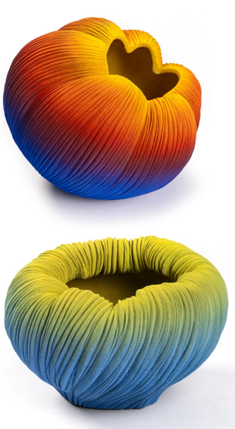 Keramiek omschrijft ze als sculpturaal met organische vormen en matte