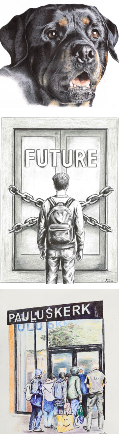 Via hen kwamen we in contact met Ainine, allicht de enige kunstenaar die zijn werken tekent in balpen. Ainine mag zich stadstekenaar van de stad Rotterdam noemen. Een ere-titel die hem op het lijf geschreven is. Rotterdam is de armste stad van Nederland, met ruim 15% van de inwoners onder de armoedegrens. Ainine is en was vele jaren één van hen. Hij tekent de armoede, de dakloosheid, de honger en de uitzichtloosheid waarin hij al zo lang geleefd heeft. Hij tekent de vluchteling langs de kant van de weg, de rij daklozen die staan aan te schuiven bij de kerk, een man die zoekt naar eetbaars in een vuilbak, de hond van één van zijn vrienden.